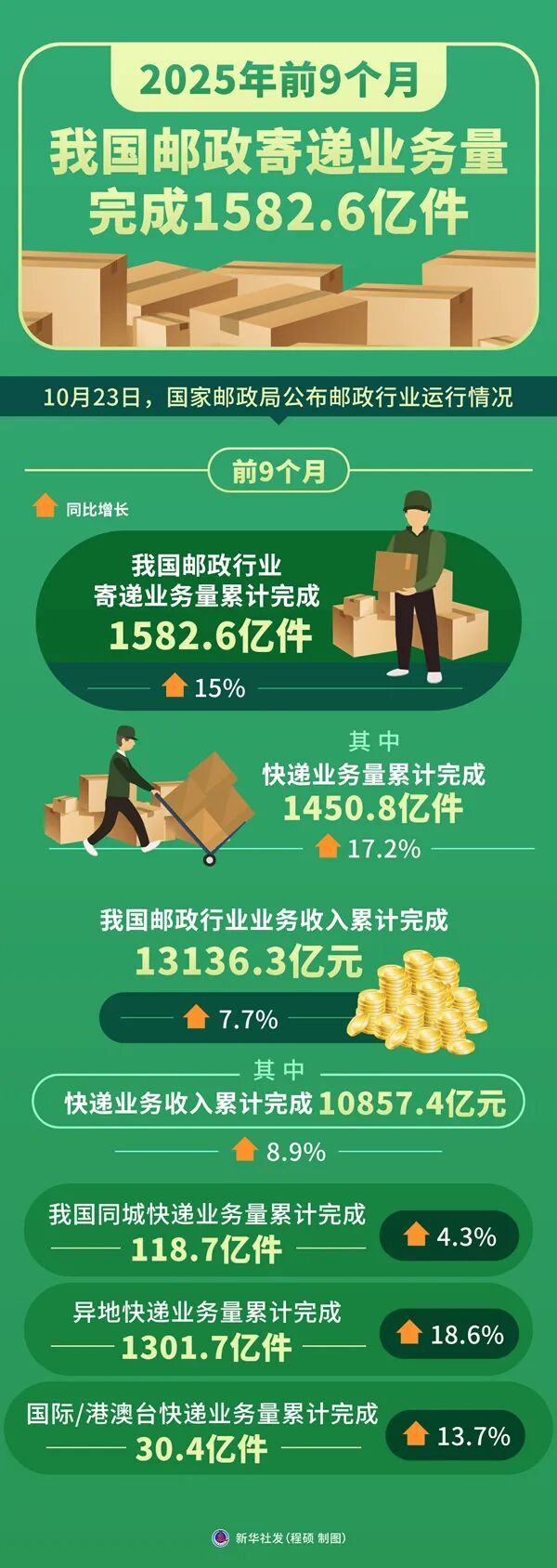 ◆ 国家邮政局消息,前9个月,我国邮政行业寄递业务量累计完成1582.6亿件,同比增长15%。
