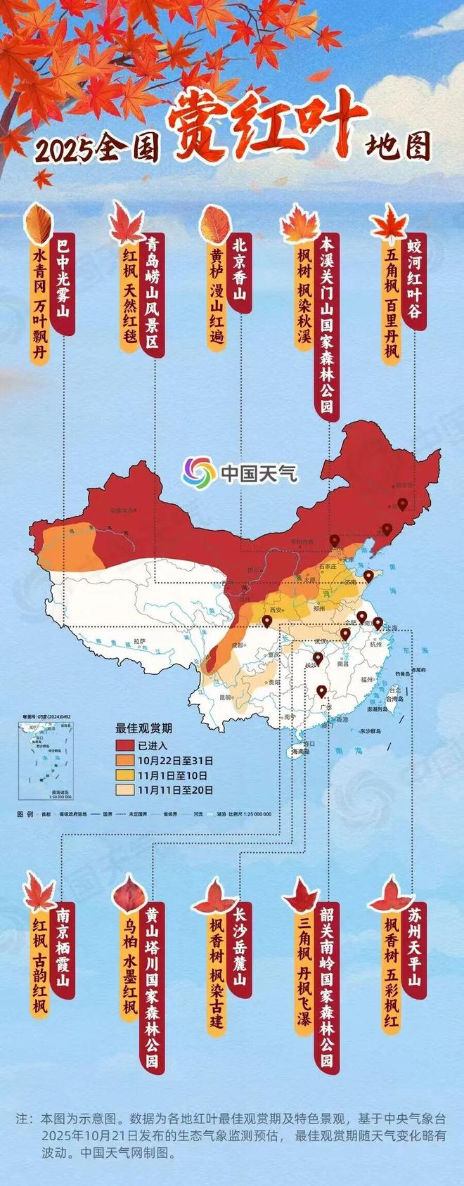 截至21日,新疆大部、内蒙古大部、陕西中北部、宁夏等地已进入红叶最佳观赏期。10月下旬,北京中南部、天津北部、河北中部、山西中南部、陕西中部、四川西北部等地也即将层林尽染。温馨提示:未来一个月,我国大江南北各大赏红叶推荐地将陆续进入最佳观赏期。